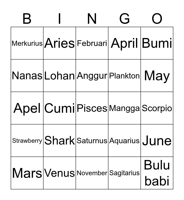 This bingo card has a free space and 24 words: Shark, Venus, Anggur, Mars, Bumi, Merkurius, Nanas, Aries, Mangga, Saturnus, Plankton, Apel, Aquarius, June, Lohan, Sagitarius, Scorpio, Februari, May, Cumi, Bulu babi, Strawberry, April and November.