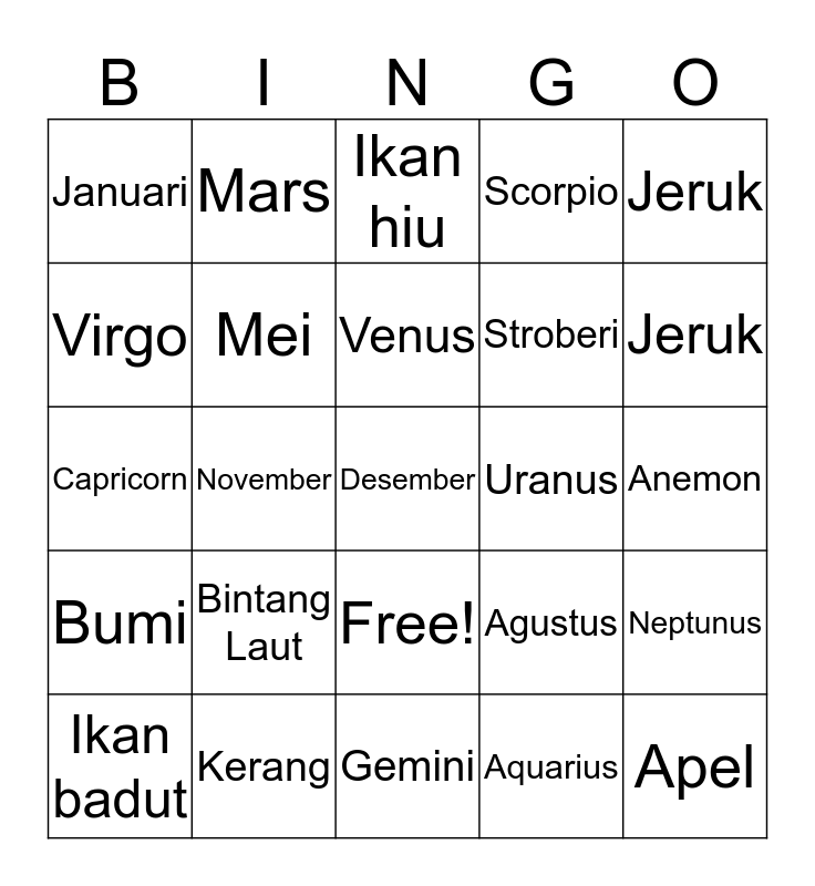 This bingo card has 26 words: Free!, Aquarius, Venus, Kerang, Jeruk, Januari, Virgo, Mars, Anemon, Agustus, Stroberi, Capricorn, Neptunus, Ikan badut, November, Mangga, Scorpio, Bumi, Ikan hiu, Desember, Jeruk, Gemini, Uranus, Bintang Laut, Mei and Apel.