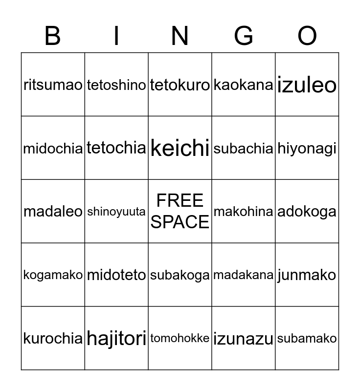 This bingo card has a free space and 24 words: midoteto, hajitori, keichi, kurochia, izuleo, ritsumao, midochia, tetoshino, makohina, subakoga, subachia, madaleo, madakana, junmako, tetochia, izunazu, adokoga, tetokuro, hiyonagi, shinoyuuta, subamako, kogamako, kaokana and tomohokke.
