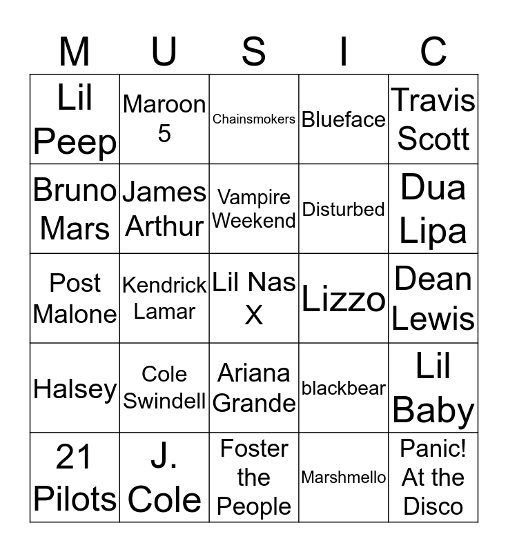 This bingo card has a free space and 27 words: blackbear, Juice WRLD, Disturbed, Foster the People, Bruno Mars, Chainsmokers, Maroon 5, Halsey, Lizzo, Lil Baby, Post Malone, Blueface, 21 Pilots, J. Cole, Dua Lipa, Thomas Rhett, James Arthur, Vampire Weekend, Cole Swindell, Lil Peep, Dean Lewis, Marshmello, Kendrick Lamar, Panic! At the Disco, Ariana Grande, Travis Scott and 5 Seconds of Summer.
