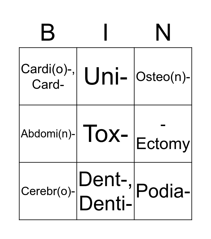 This bingo card has a free space and 17 words: Hydro-, Neuro(o)-, Osteo(n)-, Cardi(o)-, Card-, Therm(o)-, Abdomi(n)-, Audio-, Cerebr(o)-, Dent-, Denti-, -Ectomy, Bio-, Arter-, Podia-, Uni-, Naso-, Lip(o)- and Cyt-, Cyto-, -Cyte.