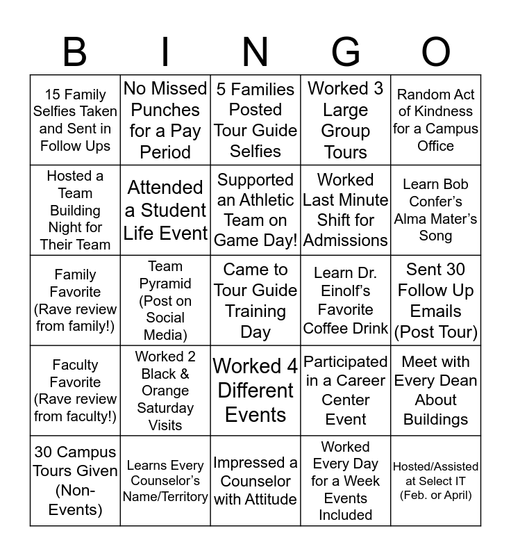 This bingo card has a free space and 24 words: Worked 2 Black & Orange Saturday Visits, Learns Every Counselor’s Name/Territory, Supported an Athletic Team on Game Day!, 30 Campus Tours Given (Non-Events), Random Act of Kindness for a Campus Office, 15 Family Selfies Taken and Sent in Follow Ups, Hosted a Team Building Night for Their Team, No Missed Punches for a Pay Period, Learn Dr. Einolf’s Favorite Coffee Drink, Worked 4 Different Events, Worked Last Minute Shift for Admissions, Family Favorite (Rave review from family!), Participated in a Career Center Event, Meet with Every Dean About Buildings, Attended a Student Life Event, Worked Every Day for a Week Events Included, Sent 30 Follow Up Emails (Post Tour), 5 Families Posted Tour Guide Selfies, Learn Bob Confer’s Alma Mater’s Song, Team Pyramid (Post on Social Media), Hosted/Assisted at Select IT (Feb. or April), Faculty Favorite (Rave review from faculty!), Worked 3 Large Group Tours and Impressed a Counselor with Attitude.