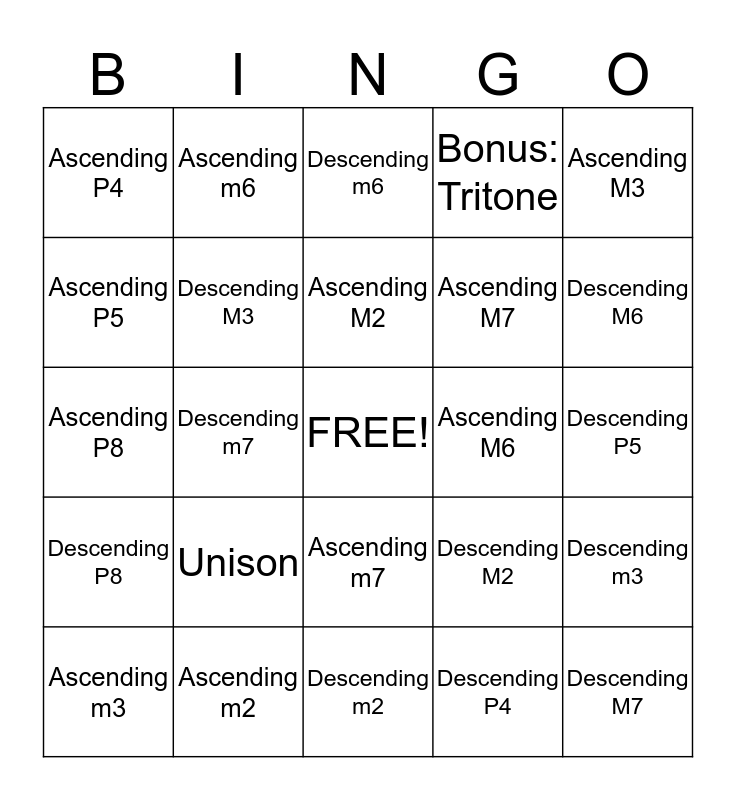 This bingo card has a free space and 24 words: Unison, Ascending m2, Ascending M2, Ascending m3, Ascending M3, Ascending P4, Ascending P5, Ascending m6, Ascending M6, Ascending m7, Ascending M7, Ascending P8, Descending M2, Descending m3, Descending M3, Descending P4, Descending P5, Descending m6, Descending M6, Descending m7, Descending M7, Descending P8, Bonus: Tritone and Descending m2.