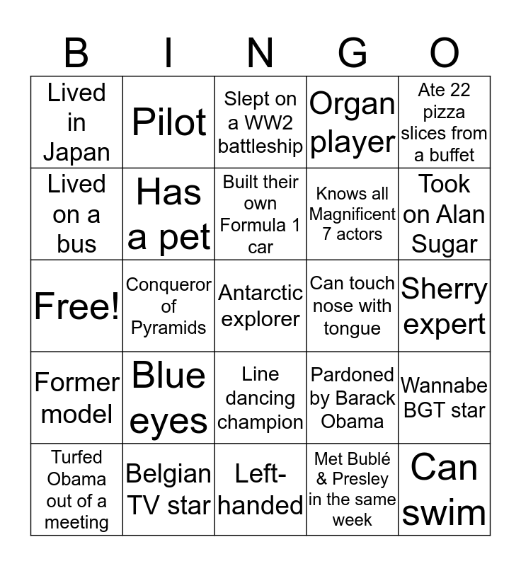 This bingo card has 26 words: Line dancing champion, Met Bublé & Presley in the same week, Built their own Formula 1 car, Belgian TV star, Ate 22 pizza slices from a buffet, Lived in Japan, Lived on a bus, Pilot, Sherry expert, Pardoned by Barack Obama, Knows all Magnificent 7 actors, Free!, Wannabe BGT star, Turfed Obama out of a meeting, Conqueror of Pyramids, Music video star, Organ player, Former model, Slept on a WW2 battleship, Antarctic explorer, Took on Alan Sugar, Left-handed, Can touch nose with tongue, Blue eyes, Has a pet and Can swim.