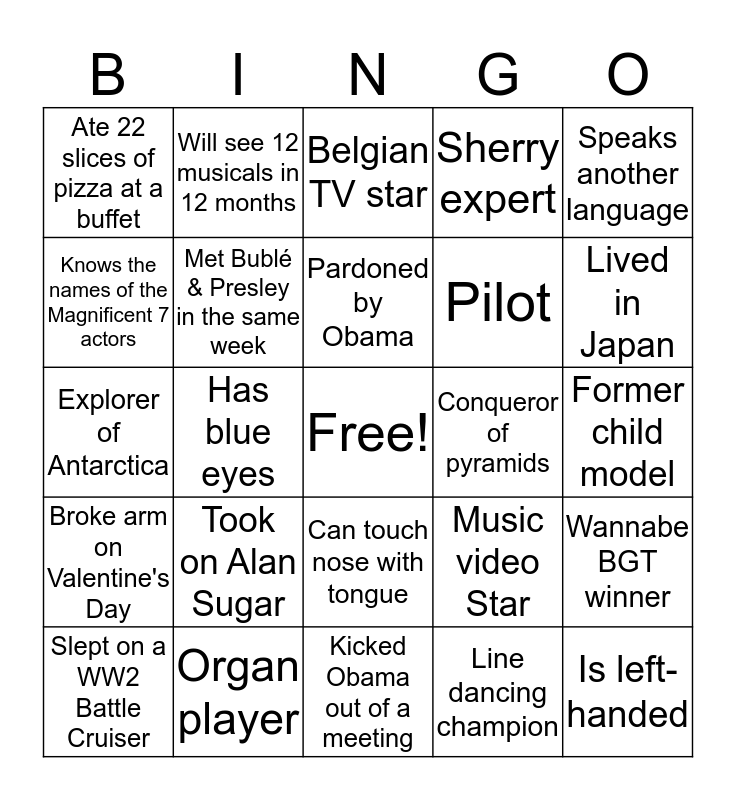 This bingo card has a free space and 27 words: Music video Star, Lived on a bus, Pilot, Kicked Obama out of a meeting, Knows the names of the Magnificent 7 actors, Belgian TV star, Will see 12 musicals in 12 months, Broke arm on Valentine's Day, Conqueror of pyramids, Wannabe BGT winner, Explorer of Antarctica, Sherry expert, Slept on a WW2 Battle Cruiser, Organ player, Lived in Japan, Built a (paper) F1 car, Met Bublé & Presley in the same week, Pardoned by Obama, Took on Alan Sugar, Ate 22 slices of pizza at a buffet, Former child model, Line dancing champion, Has blue eyes, Is left-handed, Can touch nose with tongue, Speaks another language and Has a pet.