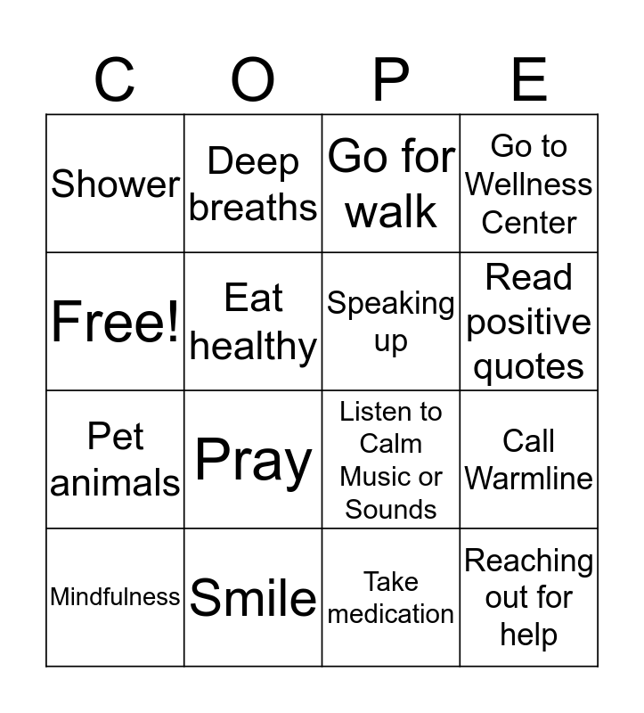 This bingo card has 16 words: Smile, Call Warmline, Go for walk, Shower, Pet animals, Deep breaths, Listen to Calm Music or Sounds, Take medication, Free!, Eat healthy, Mindfulness, Go to Wellness Center, Pray, Read positive quotes, Speaking up and Reaching out for help.