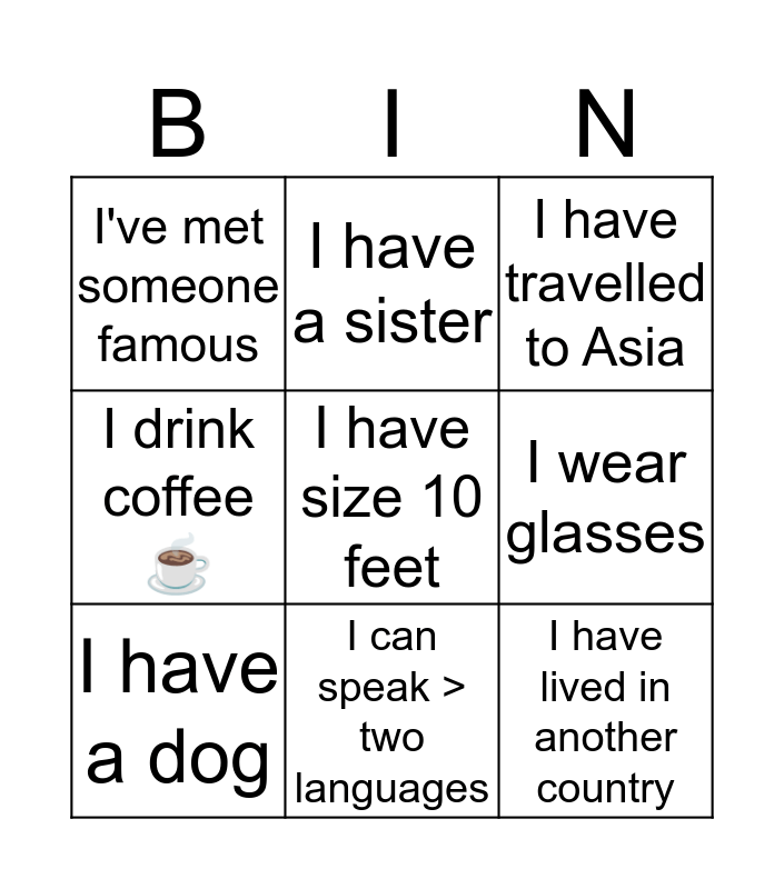 This bingo card has 9 words: I have a dog, I have travelled to Asia, I have a sister, I drink coffee ☕️, I've met someone famous, I wear glasses, I have size 10 feet, I have lived in another country and I can speak > two languages.