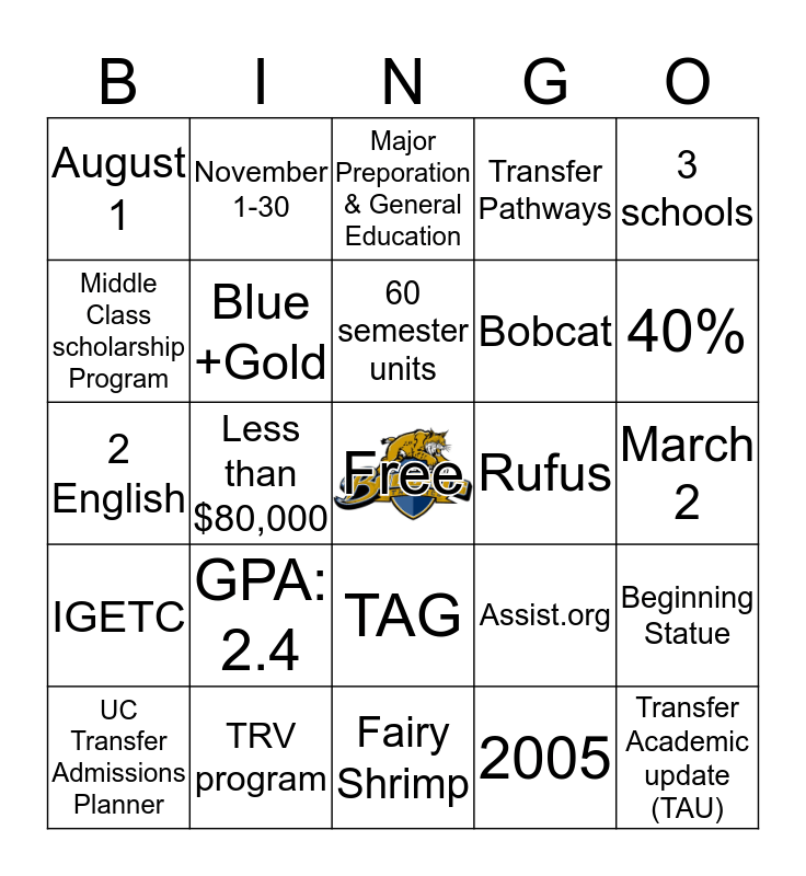This bingo card has a free space and 24 words: GPA: 2.4, TRV program, 60 semester units, UC Transfer Admissions Planner, 3 schools, August 1, Middle Class scholarship Program, November 1-30, Rufus, TAG, Bobcat, 2 English, Assist.org, Beginning Statue, Blue +Gold, 2005, March 2, Major Preporation & General Education, 40%, Less than $80,000, Transfer Academic update (TAU), IGETC, Transfer Pathways and Fairy Shrimp.