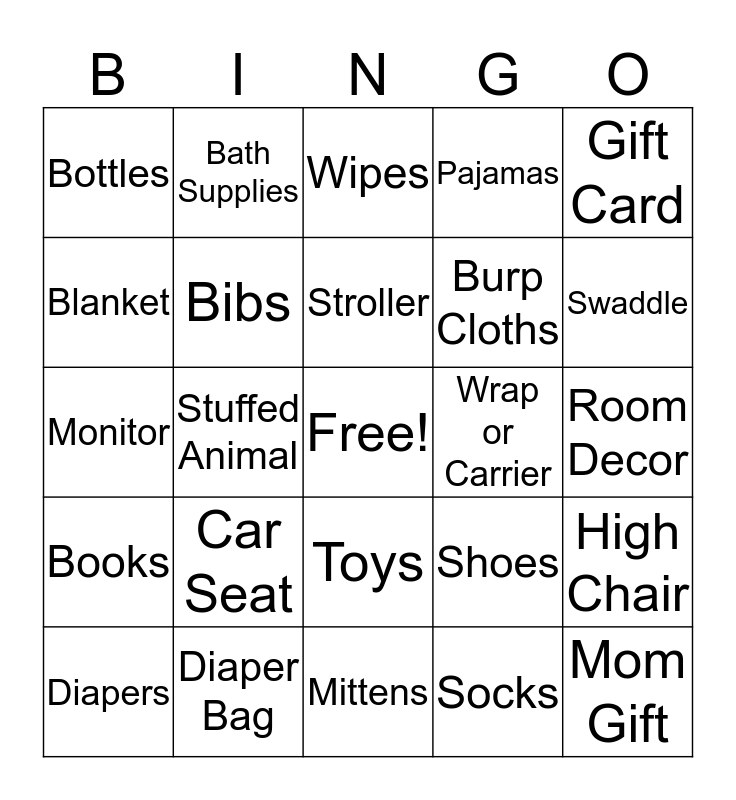 This bingo card has a free space and 24 words: Diapers, Car Seat, Stroller, Socks, Gift Card, Bottles, Bath Supplies, Wipes, Wrap or Carrier, Room Decor, Monitor, Bibs, Shoes, High Chair, Blanket, Diaper Bag, Mittens, Pajamas, Swaddle, Books, Stuffed Animal, Toys, Burp Cloths and Mom Gift.
