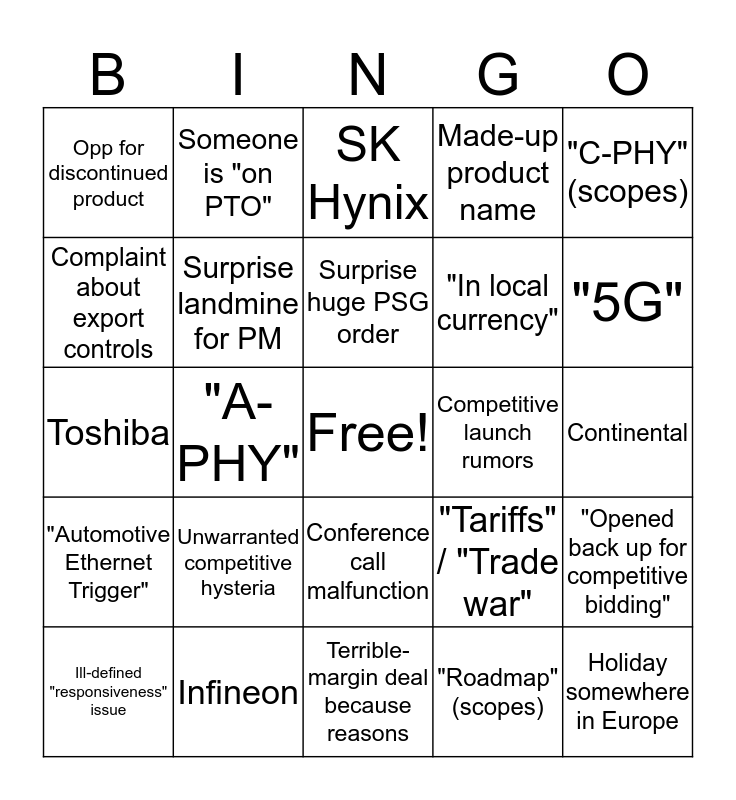 This bingo card has a free space and 48 words: "Demand softness", Holiday somewhere in Europe, LA punts LabMaster deal one more week, Terrible-margin deal because reasons, Unwarranted competitive hysteria, Warranted competitive hysteria, Someone is "on PTO", Feedback or noise, Complaint about export controls, "Exchange rate" / "Currency fluctuations", Surprise landmine for PM, Made-up product name, "Opened back up for competitive bidding", "Tariffs" / "Trade war", "Headwinds", "We need a GaN/SiC probe", Surprise huge PSG order, Competitive launch rumors, Confusing Kevin/Kevin interaction, "C-PHY" (scopes), "A-PHY", "Roadmap" (scopes), Opp for discontinued product, "In local currency", RoHS, "5G", Ill-defined "responsiveness" issue, "Zone trigger", Conference call malfunction, "Automotive Ethernet Trigger", "Tender situation", Deal waiting for customer VP signature, Magic Leap, NXP, Infineon, Hyundai, Bosch, Continental, Company with ninja turtle name, Max Planck Institute, Intel, Samsung, SK Hynix, ST Micro, Toshiba, Apple, Aptiv/Delphi and Western Digital.