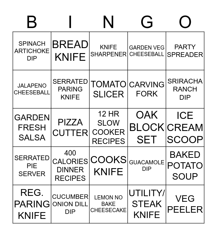 This bingo card has 25 words: 400 CALORIES DINNER RECIPES, LEMON NO BAKE CHEESECAKE, TOMATO SLICER, REG. PARING KNIFE, PARTY SPREADER, SPINACH ARTICHOKE DIP, JALAPENO CHEESEBALL, BREAD KNIFE, OAK BLOCK SET, COOKS KNIFE, CARVING FORK, GARDEN FRESH SALSA, GUACAMOLE DIP, BAKED POTATO SOUP, SERRATED PARING KNIFE, VEG PEELER, ICE CREAM SCOOP, KNIFE SHARPENER, SRIRACHA RANCH DIP, PIZZA CUTTER, 12 HR SLOW COOKER RECIPES, CUCUMBER ONION DILL DIP, SERRATED PIE SERVER, GARDEN VEG CHEESEBALL and UTILITY/ STEAK KNIFE.