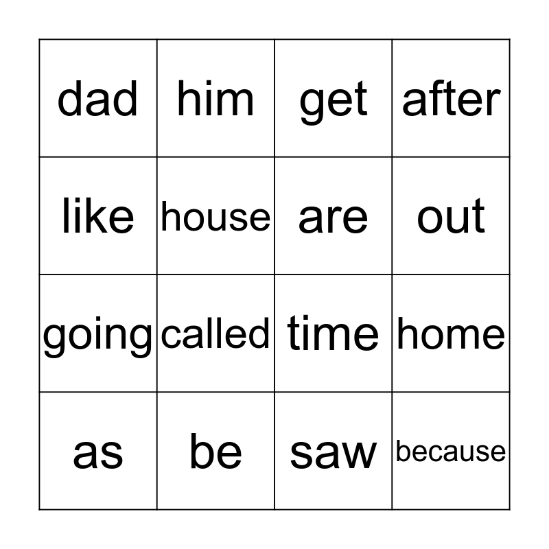 This bingo card has 20 words: home, back, get, as, as, like, be, dad, going, him, called, time, house, because, are, what, out, after, saw and came.