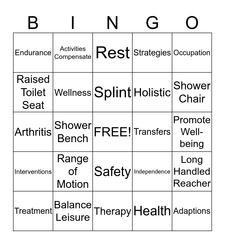 This bingo card has a free space and 24 words: Range of Motion, Balance Leisure, Splint, Treatment, Occupation, Endurance, Raised Toilet Seat, Activities Compensate, Transfers, Safety, Holistic, Arthritis, Independence, Long Handled Reacher, Wellness, Health, Promote Well-being, Rest, Shower Chair, Shower Bench, Adaptions, Interventions, Strategies and Therapy.