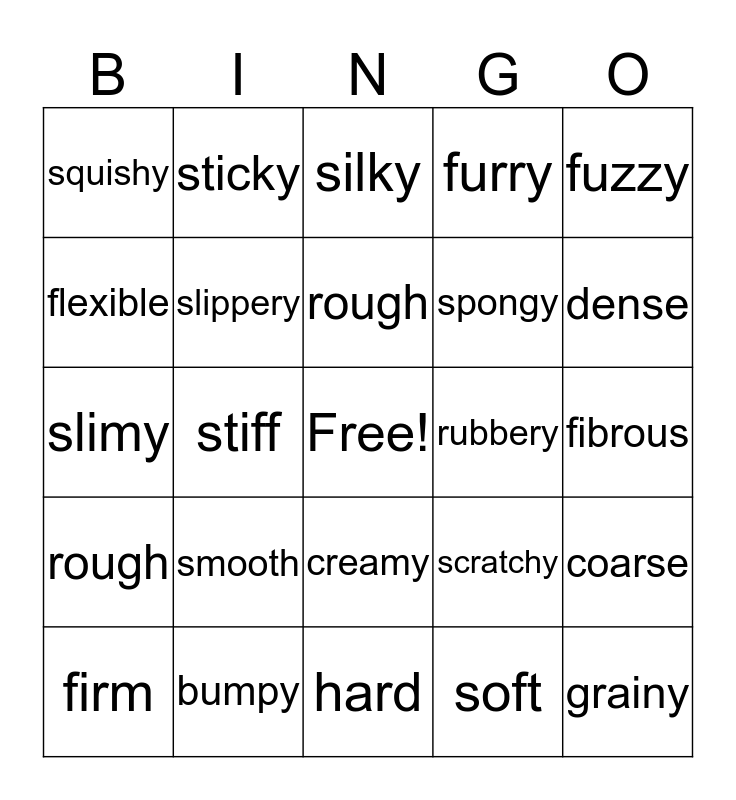 This bingo card has a free space and 24 words: smooth, bumpy, rough, firm, fuzzy, squishy, flexible, sticky, rubbery, creamy, spongy, slimy, scratchy, coarse, slippery, soft, fibrous, silky, dense, stiff, grainy, rough, furry and hard.