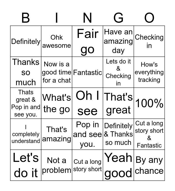 This bingo card has 25 words: That's amazing, Cut a long story short, Fantastic, Let's do it, Checking in, Definitely, Thanks so much, Ohk awesome, That's great, Pop in and see you., Lets do it & Checking in, Thats great & Pop in and see you., Definitely & Thanks so much, Cut a long story short & Fantastic, Now is a good time for a chat, By any chance, 100%, Fair go, How's everything tracking, What's the go, Oh I see, Not a problem, I completely understand, Have an amazing day and Yeah good.