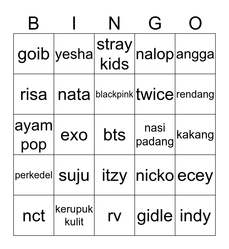 This bingo card has a free space and 24 words: suju, kerupuk kulit, blackpink, nct, angga, goib, risa, yesha, nasi padang, itzy, twice, ayam pop, nicko, ecey, nata, gidle, kakang, stray kids, rendang, exo, indy, perkedel, nalop and rv.