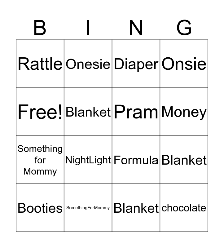 This bingo card has 36 words: Dummy, Pink, Cot, Pram, Sheets, chocolate, Money, green, Free!, Dummy, Blanket, Onsie, BabyShoes, SomethingForMommy, NightLight, Rattle, Baby Lotion, Hooded Towel, Booties, Diaper, Blanket, BIB, Babyshirt, Teether, BabayFood, Onesie, Formula, Bottle, Something for Mommy, Blanket, Hat, Chocolate, Baby shoes, Dummy, Pink and Green.