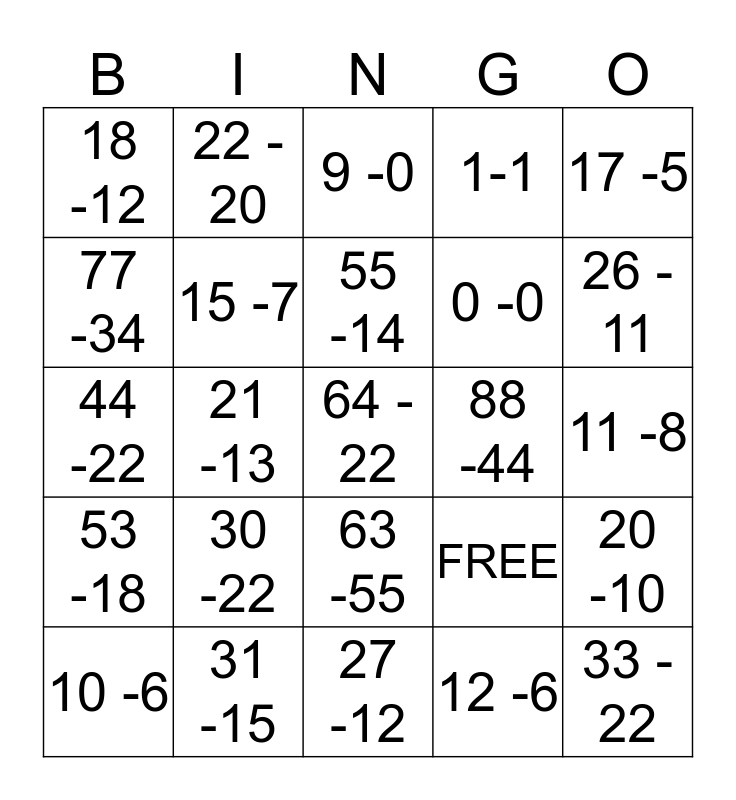 This bingo card has 25 words: 30 -22, 27 -12, 55 -14, 10 -6, 17 -5, 18 -12, 77 -34, 22 - 20, 88 -44, 63 -55, 0 -0, 44 -22, FREE, 20 -10, 15 -7, 33 - 22, 11 -8, 9 -0, 26 - 11, 21 -13, 64 - 22, 31 -15, 53 -18, 1-1 and 12 -6.