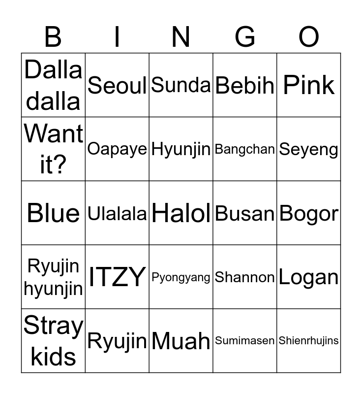 This bingo card has a free space and 24 words: ITZY, Ryujin, Hyunjin, Stray kids, Pink, Dalla dalla, Want it?, Seoul, Busan, Pyongyang, Bangchan, Blue, Shannon, Logan, Oapaye, Sumimasen, Bogor, Sunda, Seyeng, Ulalala, Shienrhujins, Ryujin hyunjin, Bebih and Muah.