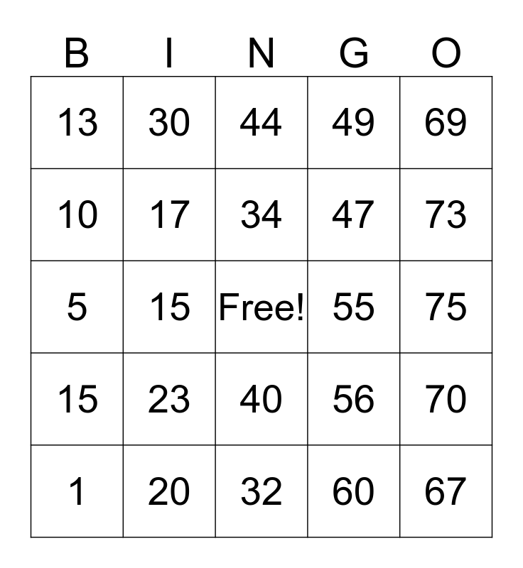 This bingo card has a free space and 24 words: 1, 23, 34, 60, 69, 13, 30, 44, 55, 75, 5, 17, 56, 70, 10, 20, 32, 49, 73, 15, 15, 40, 47 and 67.