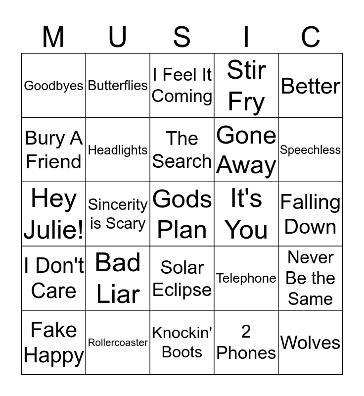 This bingo card has a free space and 27 words: Telephone, Lost & Found, Gone Away, Knockin' Boots, Bury A Friend, I Feel It Coming, Butterflies, I Don't Care, It's You, Never Be the Same, Hey Julie!, Stir Fry, Fake Happy, Rollercoaster, Speechless, Dark Times, Headlights, The Search, Bad Liar, Goodbyes, Falling Down, 2 Phones, Sincerity is Scary, Wolves, Solar Eclipse, Better and Topanga.