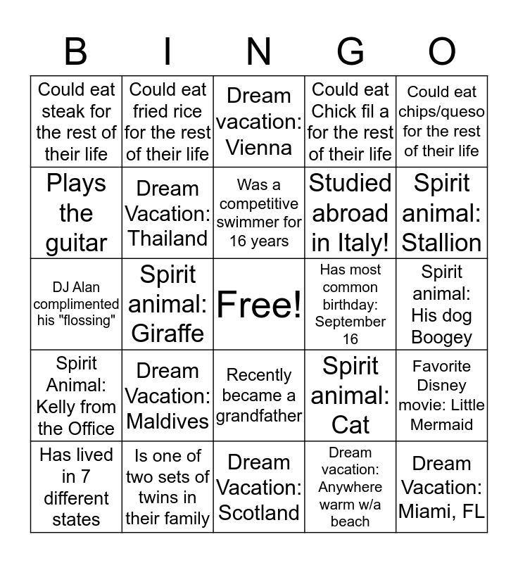 This bingo card has a free space and 24 words: Dream Vacation: Maldives, Is one of two sets of twins in their family, Was a competitive swimmer for 16 years, Has lived in 7 different states, Could eat chips/queso for the rest of their life, Could eat steak for the rest of their life, Plays the guitar, Could eat fried rice for the rest of their life, Has most common birthday: September 16, Recently became a grandfather, Studied abroad in Italy!, DJ Alan complimented his "flossing", Spirit animal: Cat, Favorite Disney movie: Little Mermaid, Dream Vacation: Thailand, Dream vacation: Anywhere warm w/a beach, Spirit animal: His dog Boogey, Dream vacation: Vienna, Spirit animal: Stallion, Spirit animal: Giraffe, Dream Vacation: Miami, FL, Spirit Animal: Kelly from the Office, Could eat Chick fil a for the rest of their life and Dream Vacation: Scotland.