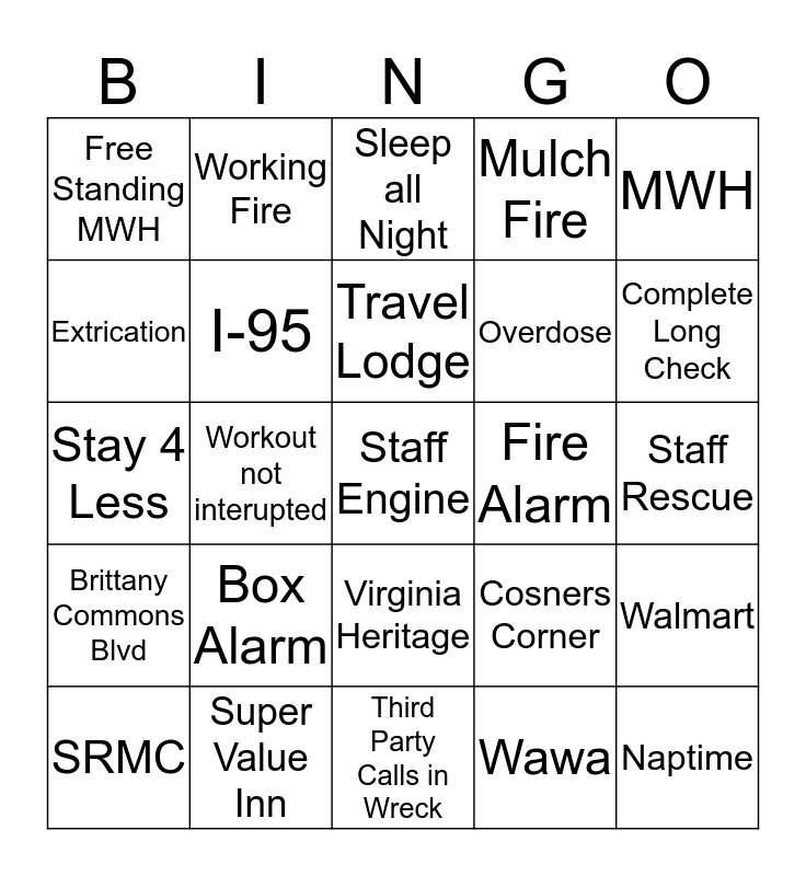 This bingo card has a free space and 24 words: Box Alarm, Super Value Inn, Travel Lodge, SRMC, MWH, Free Standing MWH, Extrication, Working Fire, Fire Alarm, Virginia Heritage, Overdose, Stay 4 Less, Cosners Corner, Walmart, I-95, Wawa, Staff Rescue, Sleep all Night, Complete Long Check, Workout not interupted, Naptime, Brittany Commons Blvd, Mulch Fire and Third Party Calls in Wreck.