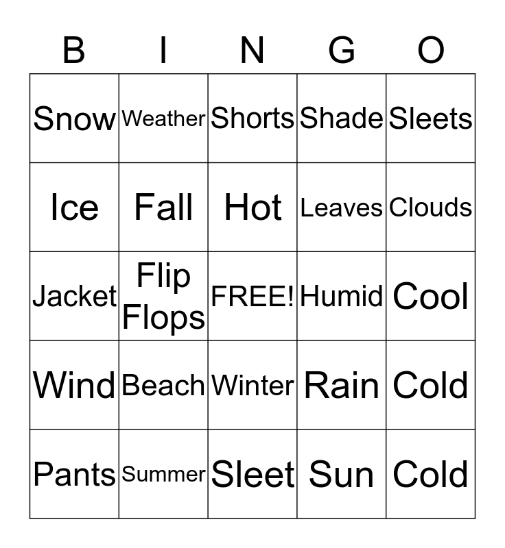 This bingo card has a free space and 24 words: Beach, Summer, Hot, Pants, Sleets, Snow, Ice, Weather, Humid, Winter, Leaves, Jacket, Rain, Cold, Fall, Sun, Cool, Shorts, Clouds, Flip Flops, Cold, Wind, Shade and Sleet.