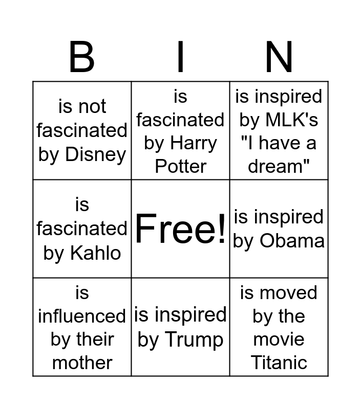 This bingo card has a free space and 8 words: is inspired by Obama, is inspired by MLK's "I have a dream", is fascinated by Harry Potter, is influenced by their mother, is not fascinated by Disney, is moved by the movie Titanic, is fascinated by Kahlo and is inspired by Trump.