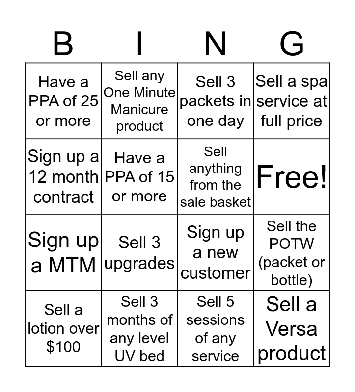 This bingo card has 17 words: Sell 5 sessions of any service, Sell a lotion over $100, Sell 3 packets in one day, Have a PPA of 25 or more, Sell 3 upgrades, Sell a spa service at full price, Sell the POTW (packet or bottle), Sell anything from the sale basket, Free!, Have a PPA of 15 or more, Sell 3 months of any level UV bed, Sign up a new customer, Sign up a 12 month contract, Sell any One Minute Manicure product, Sign up a MTM, Sell any lotion and Sell a Versa product.