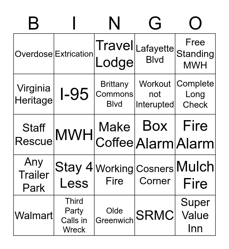 This bingo card has a free space and 24 words: Stay 4 Less, Third Party Calls in Wreck, Brittany Commons Blvd, Walmart, Free Standing MWH, Overdose, Virginia Heritage, Extrication, Box Alarm, Working Fire, Workout not Interupted, Staff Rescue, Cosners Corner, Mulch Fire, I-95, SRMC, Fire Alarm, Travel Lodge, Complete Long Check, MWH, Super Value Inn, Any Trailer Park, Lafayette Blvd and Olde Greenwich.