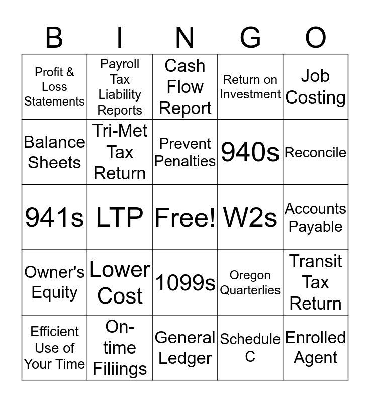 This bingo card has a free space and 24 words: Lower Cost, On-time Filiings, Prevent Penalties, Efficient Use of Your Time, Job Costing, Profit & Loss Statements, Balance Sheets, Payroll Tax Liability Reports, W2s, 1099s, 940s, 941s, Oregon Quarterlies, Transit Tax Return, Tri-Met Tax Return, Schedule C, Accounts Payable, Cash Flow Report, Reconcile, LTP, Enrolled Agent, Owner's Equity, Return on Investment and General Ledger.