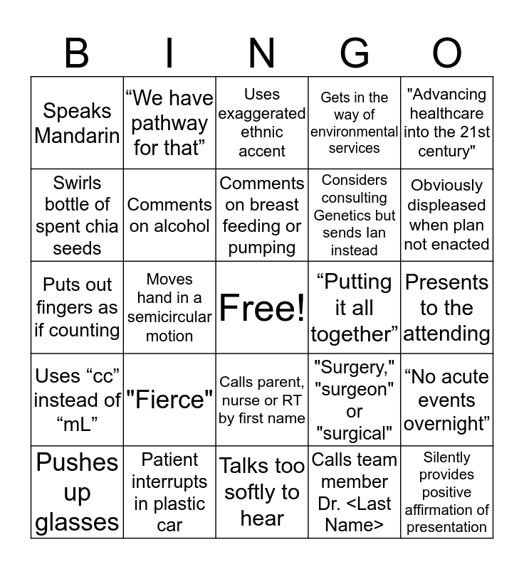 This bingo card has a free space and 28 words: “No acute events overnight”, "I totally agree” or "I have nothing to add", Considers consulting Genetics but sends Ian instead, Calls team member Dr. <Last Name>, Swirls bottle of spent chia seeds, Uses exaggerated ethnic accent, “We have pathway for that”, Uses “cc” instead of “mL”, “Putting it all together”, Pushes up glasses, Puts out fingers as if counting, Gets in the way of environmental services, Patient interrupts in plastic car, Talks too softly to hear, Obviously displeased when plan not enacted, Pends orders before rounds, "Fierce", Comments on alcohol, Comments on breast feeding or pumping, Calls parent, nurse or RT by first name, Speaks Mandarin, "For the medical students", Silently provides positive affirmation of presentation, Moves hand in a semicircular motion, Presents to the attending, "Surgery," "surgeon" or "surgical", "Advancing healthcare into the 21st century" and Openly challenges authority.