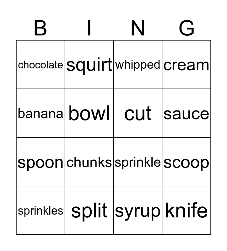 This bingo card has 20 words: scoop, pour, whipped, pineapple, sprinkles, banana, split, chocolate, spoon, squirt, chunks, sprinkle, bowl, knife, cut, between, sauce, cream, syrup and dessert.