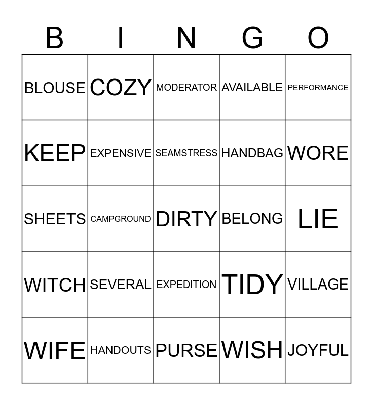 This bingo card has 70 words: HANDBAG, LIE, STUNG, ENCHANT, HANDOUTS, TUXEDO, AVAILABLE, Window Shopping, PERFORMANCE, LEGEND, VILLAGE, SUIT, BLOUSE, MODERATOR, COWARD, CAMPGROUND, EXPEDITION, HANDBAG, KIDKNAP, WITCH, BELONG, TIDY, WORE, SIDEWALK, PLENTY, GET, CHORE, PARADE, WISH, THOUGHT, COZY, SHRIMP, GRILL, AMOUNT, THROW, UNPLESANT, FLATS, AGREE, TRY, KEEP, JOYFUL, SEVERAL, DIRTY, HOLDING, THROW, EXPENSIVE, WIFE, GARMENT, WEAR, ENVIRONMENT, ERASER, HUG, FURNISHED, BRIEFCASE, PURSE, LANDLORD, SEAMSTRESS, MISCHIEF, SPICY, JOURNEY, SHEETS, FORGOT, SPOKE, FILL, WHEAT, RISE, TROUSERS, DOWNTIME, FIRST and AGREE.