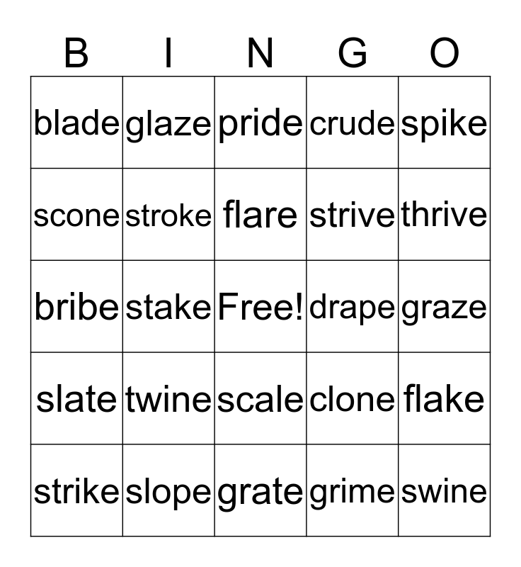 This bingo card has a free space and 24 words: twine, slope, flare, strike, spike, blade, scone, glaze, drape, scale, strive, bribe, clone, flake, stroke, grime, graze, pride, thrive, stake, swine, slate, crude and grate.