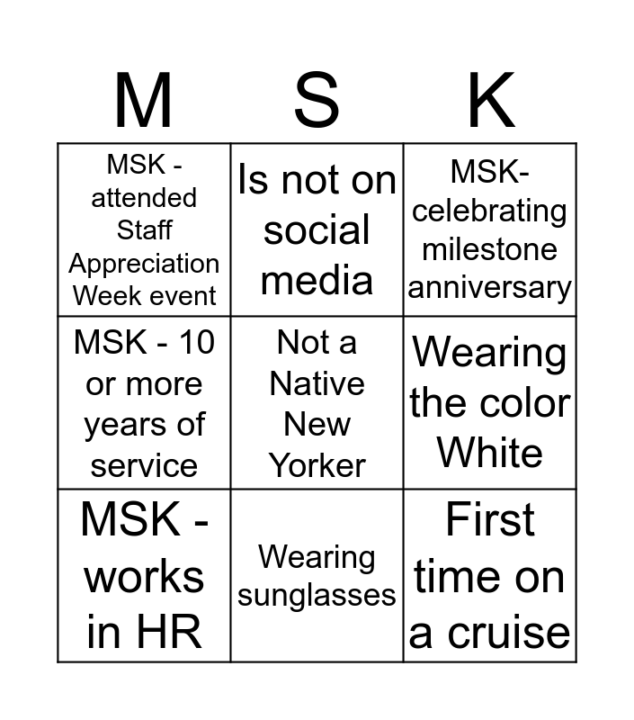 This bingo card has a free space and 8 words: Wearing the color White, MSK- celebrating milestone anniversary, Is not on social media, MSK - works in HR, MSK - attended Staff Appreciation Week event, First time on a cruise, MSK - 10 or more years of service and Wearing sunglasses.