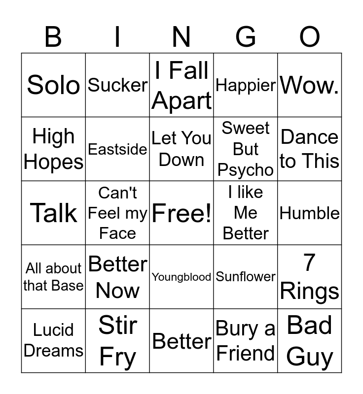 This bingo card has a free space and 36 words: Here with Me, Drew Barrymore, Girls Like You, Eastside, Sunflower, All about that Base, Let You Down, Old Town Road, Wow., Senorita, Can't Feel my Face, Happier, Numb, I like Me Better, Dance to This, Solo, In My Feelings, Better Now, Bad Guy, I Fall Apart, Humble, 7 Rings, Stir Fry, Lucid Dreams, Better, Sucker, Talk, If I Can't Have You, Sweet But Psycho, High Hopes, Dancing with a Stranger, Truth Hurts, Bury a Friend, Youngblood, Beautiful and Natural.