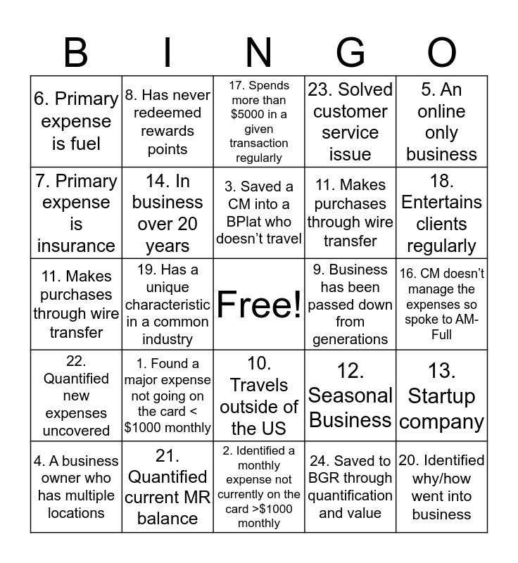 This bingo card has a free space and 25 words: 1. Found a major expense not going on the card < $1000 monthly, 2. Identified a monthly expense not currently on the card >$1000 monthly, 3. Saved a CM into a BPlat who doesn’t travel, 4. A business owner who has multiple locations, 5. An online only business, 6. Primary expense is fuel, 7. Primary expense is insurance, 8. Has never redeemed rewards points, 9. Business has been passed down from generations, 10. Travels outside of the US, 11. Makes purchases through wire transfer, 11. Makes purchases through wire transfer, 12. Seasonal Business, 13. Startup company, 14. In business over 20 years, 15. Sole proprietor, 16. CM doesn’t manage the expenses so spoke to AM-Full, 17. Spends more than $5000 in a given transaction regularly, 18. Entertains clients regularly, 19. Has a unique characteristic in a common industry, 20. Identified why/how went into business, 21. Quantified current MR balance, 22. Quantified new expenses uncovered, 23. Solved customer service issue and 24. Saved to BGR through quantification and value.