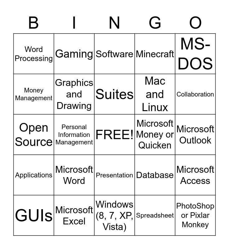 This bingo card has a free space and 24 words: Microsoft Word, Microsoft Excel, Suites, GUIs, MS-DOS, Word Processing, Money Management, Gaming, Microsoft Money or Quicken, Presentation, Mac and Linux, Open Source, Database, Microsoft Access, Graphics and Drawing, Spreadsheet, Microsoft Outlook, Software, Collaboration, Personal Information Management, PhotoShop or Pixlar Monkey, Applications, Minecraft and Windows (8, 7, XP, Vista).