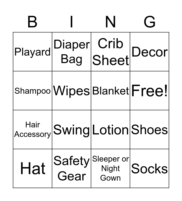 This bingo card has 35 words: Bottle, Pacifier, Onsie, Blanket, Diapers, Decor, Wipes, Sling or Carrier, Free!, Bib, Lotion, Shampoo, Toys, Homemade, Playard, Safety Gear, Piggy Bank, Shoes, Socks, Hat, Mittens, Baby Powder, Diaper Cream, Baby Monitor, Crib Sheet, Swing, Bouncer, Diaper Pail, Hair Accessory, Sleeper or Night Gown, Towel, Outfit, Something for Mom, Diaper Bag and Memory Book.