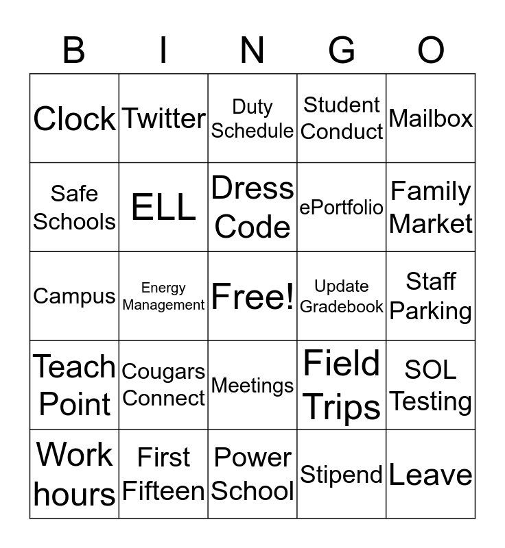 This bingo card has a free space and 27 words: Field Trips, Movies, ePortfolio, Power School, Safe Schools, Duty Schedule, Twitter, Teach Point, Update Gradebook, SOL Testing, Campus, Student Conduct, Work hours, First Fifteen, Family Market, Orientation, ELL, Dress Code, Cougars Connect, Clock, Staff Parking, Stipend, Energy Management, Leave, Meetings, Mailbox and Crisis Plans.