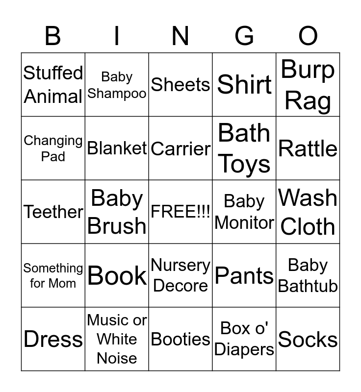 This bingo card has a free space and 34 words: Onesie, Box o' Diapers, Pacifier, Bottle, Something for Mom, Blanket, Burp Rag, Dress, Baby Shampoo, Diaper Cream, Carrier, Sheets, Formula, Baby Lotion, Baby Monitor, Rattle, Music or White Noise, Teether, Book, Pants, Nursery Decore, Wipes, Stuffed Animal, Wash Cloth, Booties, Socks, Shirt, Hat, Bath Toys, Changing Pad, Bib, Baby Brush, Baby Bathtub and Nail Clippers.