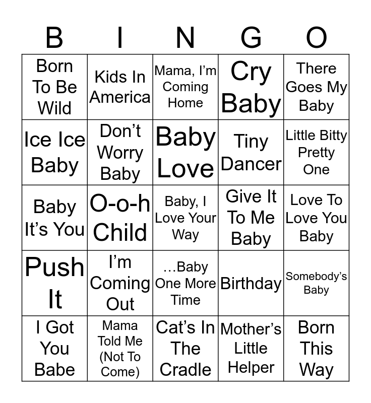 This bingo card has 39 words: Be My Baby, Always Be My Baby, Baby Baby, Don’t Worry Baby, I Got You Babe, …Baby One More Time, Baby Love, Sweet Child O’ Mine, There Goes My Baby, Push It, O-o-h Child, Cry Baby, Baby, I Love Your Way, Love To Love You Baby, Give It To Me Baby, I’m Coming Out, Born In The U.S.A., Born To Be Wild, Baby Got Back, Birthday, Ice Ice Baby, Cat’s In The Cradle, Tiny Dancer, Little Bitty Pretty One, Mama Said Knock You Out, Cry Baby Cry, Born This Way, Mother, Your Mother Should Know, Kids In America, Mamma Mia, Baby I Need Your Loving, Mama, I’m Coming Home, Mama Told Me (Not To Come), Mother’s Little Helper, Come On Over Baby, Somebody’s Baby, Baby It’s You and Message In A Bottle.