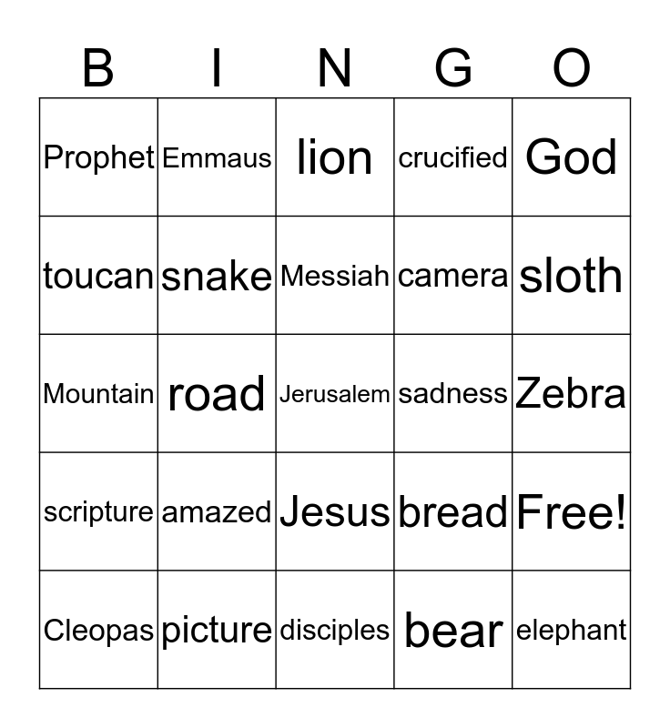 This bingo card has 26 words: Jesus, bear, Messiah, picture, God, Prophet, toucan, Emmaus, Zebra, bread, camera, Mountain, Free!, Cleopas, road, trial, crucified, scripture, lion, Jerusalem, sloth, disciples, sadness, amazed, snake and elephant.