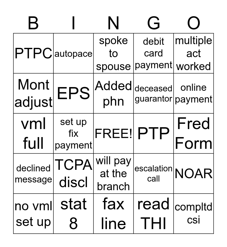 This bingo card has a free space and 37 words: Bucket payment, 12 months of maps, ASPS, EPS, NOAR, TCPA discl, Added phn, no payments by 9am, multiple act worked, last name starts with w born 1975, set up fix payment, debit card payment, compltd csi, Fred Form, Mont adjust, declined message, 3rd party msg, spoke to spouse, will pay at the branch, PTP, PTPC, online payment, no vml set up, fax line, dead air, read THI, autopace, Inward, NIS, talked to Ap, BUDE form, stat 8, vml full, customer service tfr, escalation call, deceased guarantor and dmp csi.