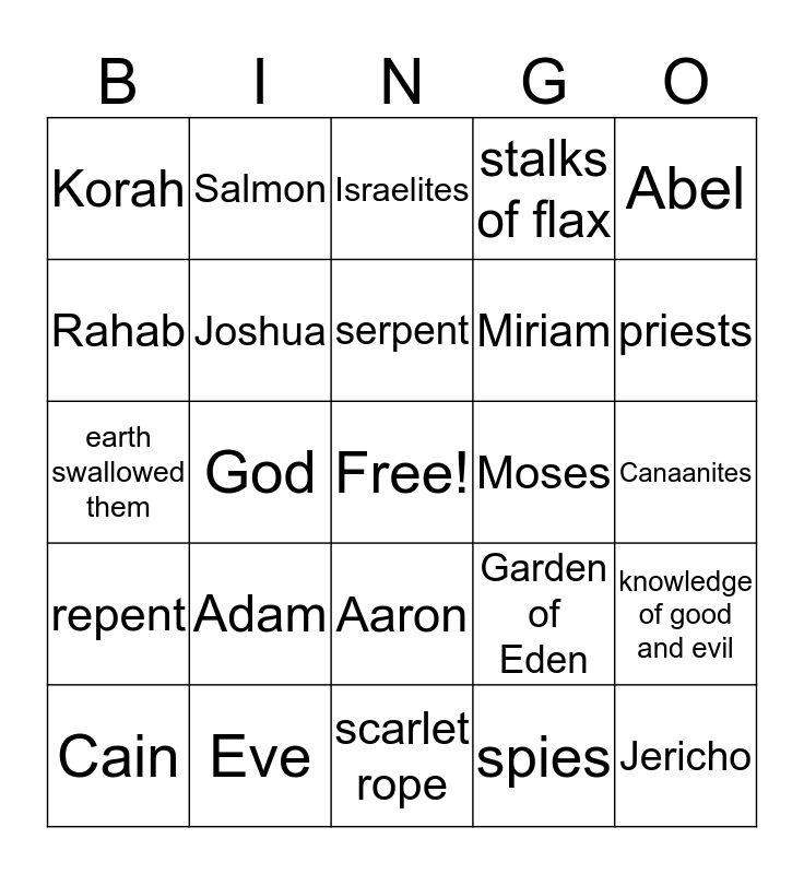 This bingo card has a free space and 24 words: Adam, Eve, serpent, Cain, Abel, Korah, Rahab, Salmon, Moses, Aaron, Miriam, earth swallowed them, Garden of Eden, knowledge of good and evil, Joshua, spies, Canaanites, Israelites, priests, God, Jericho, repent, stalks of flax and scarlet rope.
