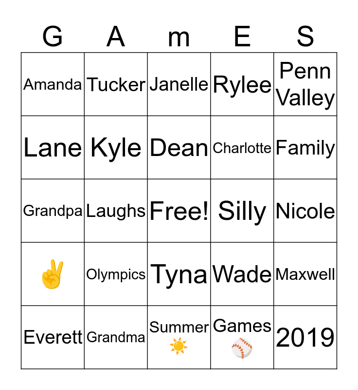 This bingo card has a free space and 24 words: Olympics, Grandma, Dean, Everett, Penn Valley, Amanda, Lane, Tucker, Silly, Tyna, Charlotte, Grandpa, Wade, Maxwell, Kyle, Games⚾️, Nicole, Janelle, Family, Laughs, 2019, ✌, Rylee and Summer☀️.