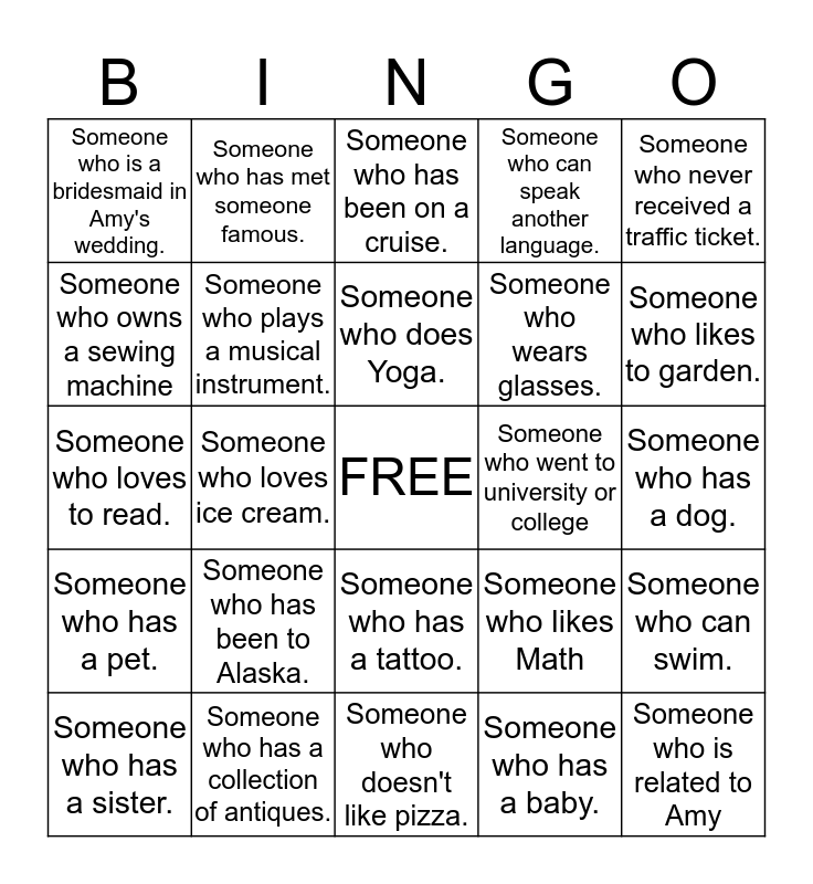 This bingo card has a free space and 24 words: Someone who has a sister., Someone who has been to Alaska., Someone who does Yoga., Someone who has a baby., Someone who never received a traffic ticket., Someone who is a bridesmaid in Amy's wedding., Someone who has met someone famous., Someone who has been on a cruise., Someone who went to university or college, Someone who has a dog., Someone who loves to read., Someone who plays a musical instrument., Someone who likes Math, Someone who can swim., Someone who owns a sewing machine, Someone who has a collection of antiques., Someone who doesn't like pizza., Someone who can speak another language., Someone who likes to garden., Someone who has a pet., Someone who loves ice cream., Someone who has a tattoo., Someone who wears glasses. and Someone who is related to Amy.