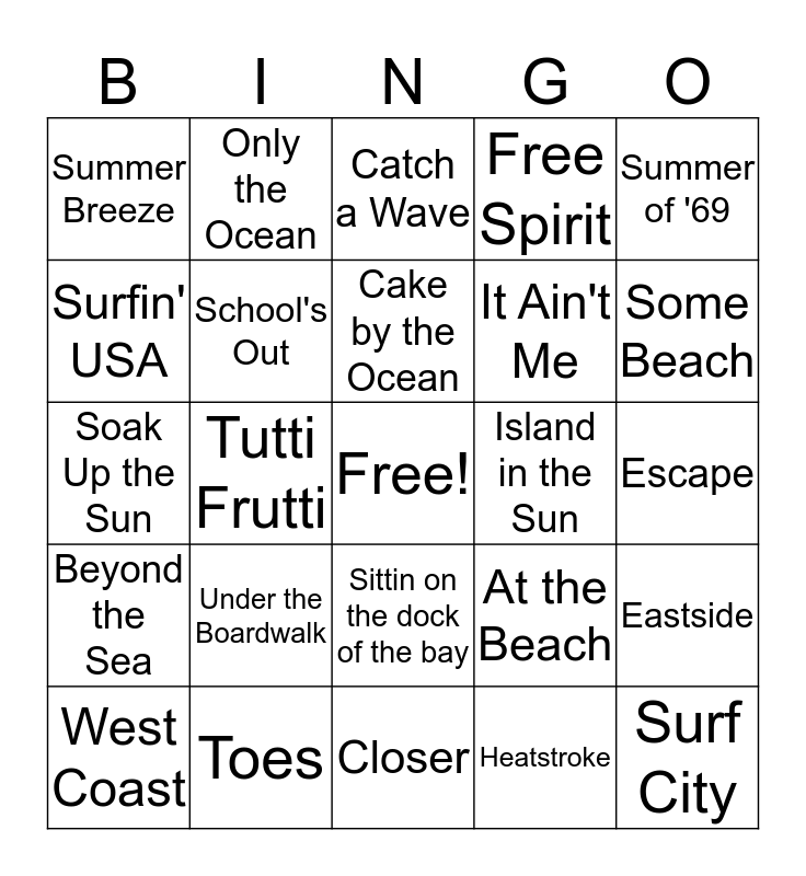 This bingo card has a free space and 24 words: Under the Boardwalk, Toes, Cake by the Ocean, West Coast, Summer of '69, Summer Breeze, Surfin' USA, Only the Ocean, Island in the Sun, Sittin on the dock of the bay, It Ain't Me, Soak Up the Sun, At the Beach, Eastside, School's Out, Heatstroke, Escape, Catch a Wave, Some Beach, Tutti Frutti, Surf City, Beyond the Sea, Free Spirit and Closer.